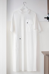 大きなポケットがポイントのカット地の襟付きワンピースです。ワイドなストレートラインのが清楚な印象の一枚です。ボトムにデニムパンツを合わせてカジュアルに合わせたり、一枚で着てキレイめの着こなしたり…、夏のお出かけに最適な一枚です。
