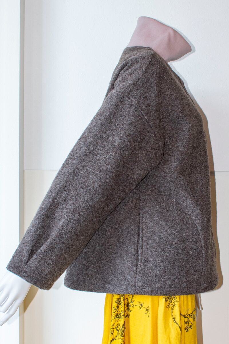 ノーカラーの厚手ウールジャケットです。毛足があるフワッとした素材感で軽くて暖かく、寒くなる季節にピッタリ‼ 短め丈のアウターなので動きやすく少し長めの丈感で体系がカバーでき、シンプルなボックスシルエットボトムも合わせやすく普段使いに最適な一枚です。