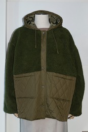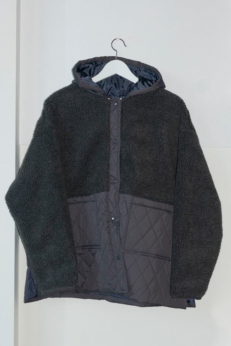 ボア素材とナイロンキルティングのハーフコートです。少し短めのオーバーサイズでゆったりしたシルエットです。中綿タイプなので温かくお手入れもしやすい普段使いに便利な一枚です。カジュアルなボトムと相性がいいメリハリが効いたデザインです、