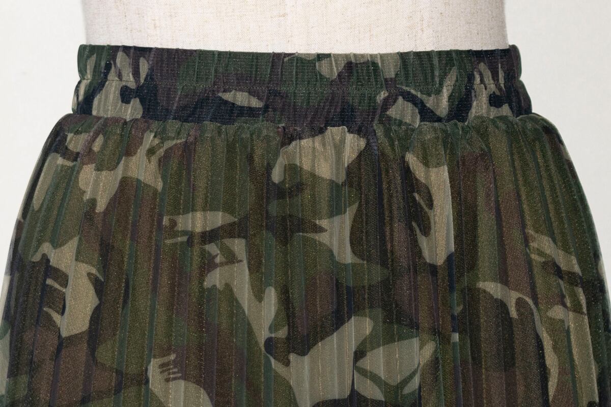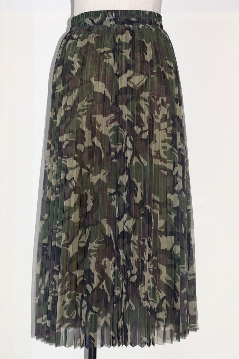 カモフラプリントのチュールレースのプリーツスカートです。定番デザインのプリーツスカートにインパクトのあるプリントが印象的なボトムです。ニットやカットソーなどのシンプルなトップスを合わせて落ち着いた感じのコーディネートがお勧めです。